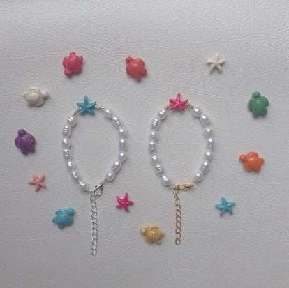 Zomerse zoetwaterparel zeester armbandjes. €3,- euro per stuk. Beschikbaar in het zilver of goud. Ook kun je kiezen uit de schildpadden/zeester kleuren van foto 1.