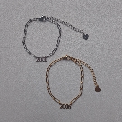 Stainless steel jaartal armbanden. Beschikbaar in goud en zilver. Stainless steel, dus je kan ermee zwemmen en douchen. 17 cm + 5 cm verlengstuk (23 cm totaal). Diverse jaartallen beschikbaar.