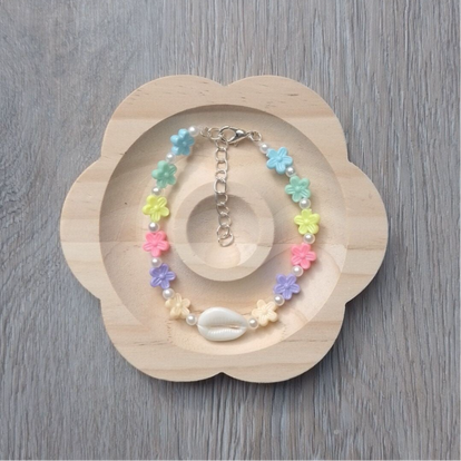 Bloemen schelpen armband. Keuze uit zilveren of gouden sluiting. €2,- euro per stuk.
