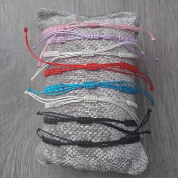 Geknoopte armbandjes, met schuifknoop (16 cm tot 28 cm polslengte). €1,25 euro per stuk!
