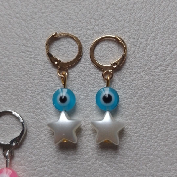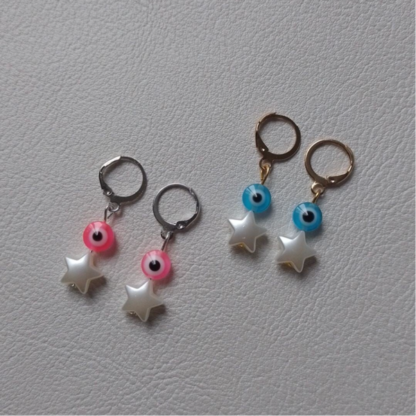 Rvs (roestvrijstalen) lucky eye oorbellen. Beschikbaar in verschillende kleuren oogjes en keuze uit goud of zilveren oorbellen. €3,50 euro per paar.