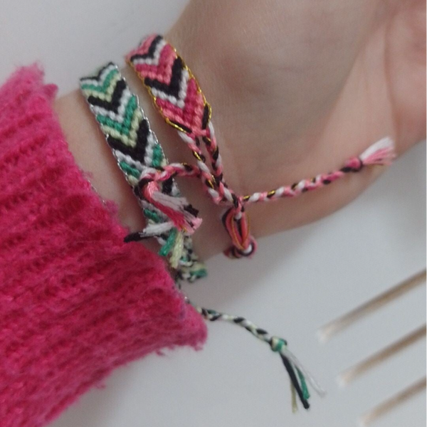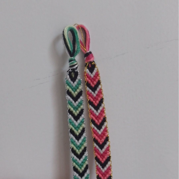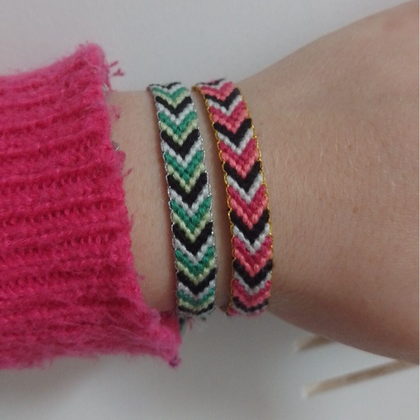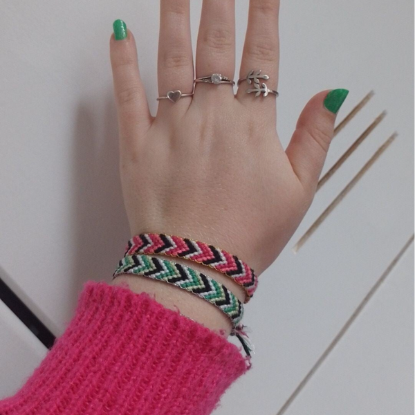 Geknoopte armbandjes met een gouden of zilveren randje. Beschikbaar in verschillende kleuren. €3,- euro per stuk.