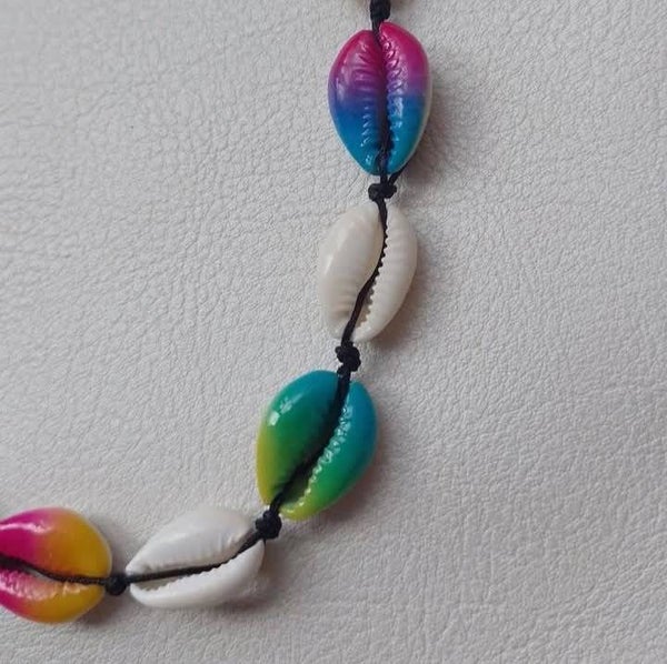 Super leuke zomerse kauri schelpen ketting regenboog. €6,- euro per stuk. Beschikbaar met zilveren of gouden sluiting.